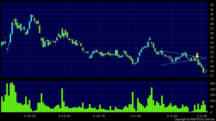 Triangle Breakout means the volatility of price movement is decreasing, stock price finally broke the bottom of triangle. A downward trend will start.(HK stocks quote is delayed for at least 15 mins.Short Selling Data as at 2026-03-06 16:25.)