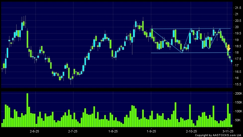 区域突破指股价在过去的一段时间只在一个范围在内活动,然後股价下跌作出突破,跌穿区域的底部,技术走势偏软。(港股报价延迟最少十五分钟。沽空资料截至 2025-11-05 12:25。)