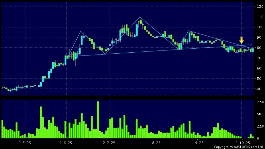 头肩顶是典型的沽出讯号,当股价跌穿支持线(颈线)时,跌势确认股价将持续下跌,技术走势偏软。(港股报价延迟最少十五分钟。)