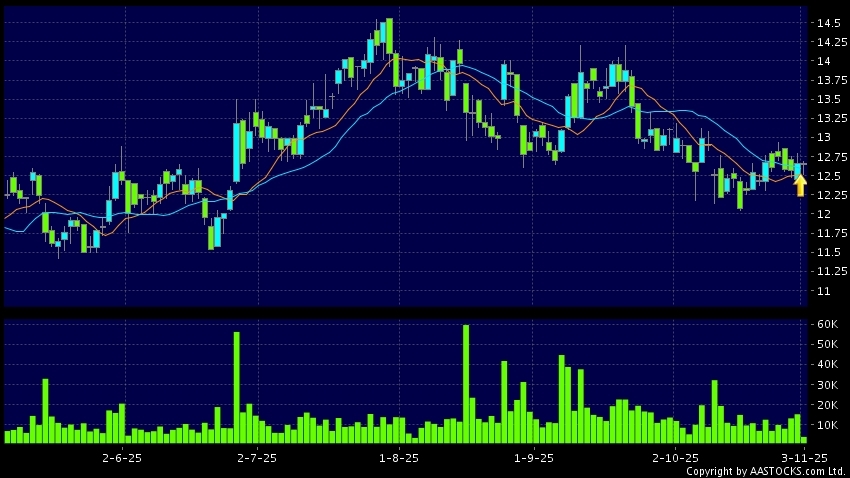 京东物流(02618.HK)  -0.210 (-1.647%)    沽空 $7.76百万; 比率 22.682%   10天移动平均线升穿20天移动平均线,出现黄金交叉。现价报12.630,下跌0.237%,成交量3.92百万股,成交额4.93千万。
