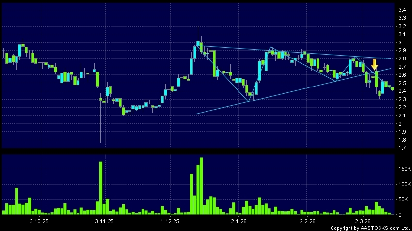 三角形向下突破是指股价的波幅渐渐收窄,在图表上形成三角形般的状态。股价在三角形的末端向下突破,下跌趋势形成,技术走势偏软。(港股报价延迟最少十五分钟。沽空资料截至 2026-03-13 16:25。)