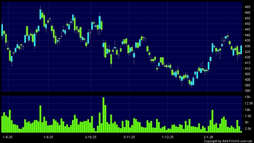 香港交易所(00388.HK) +7.400 (+1.749%) 沽空 $2.23亿; 比率 12.454% 呈现杯柄形向上突破。现价报431.600,上升2.033%,成交量1.83百万股,成交额7.82亿。
