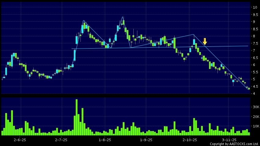博雅互動(00434.HK) +0.130 (+3.562%) 沽空 $2.68百萬; 比率 8.228% 呈現頭肩頂向下突破。現價報4.300,下跌2.715%,成交量3.41百萬股,成交額1.47千萬。