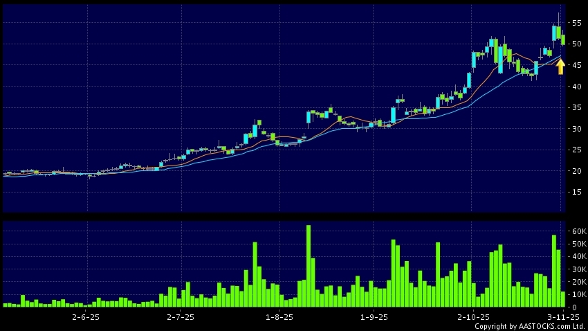 贛鋒鋰業(01772.HK) -0.850 (-1.657%) 沽空 $4.60千萬; 比率 4.830% 10天移動平均線升穿20天移動平均線,出現黃金交叉。現價報49.820,下跌2.885%,成交量1.23千萬股,成交額6.21億。