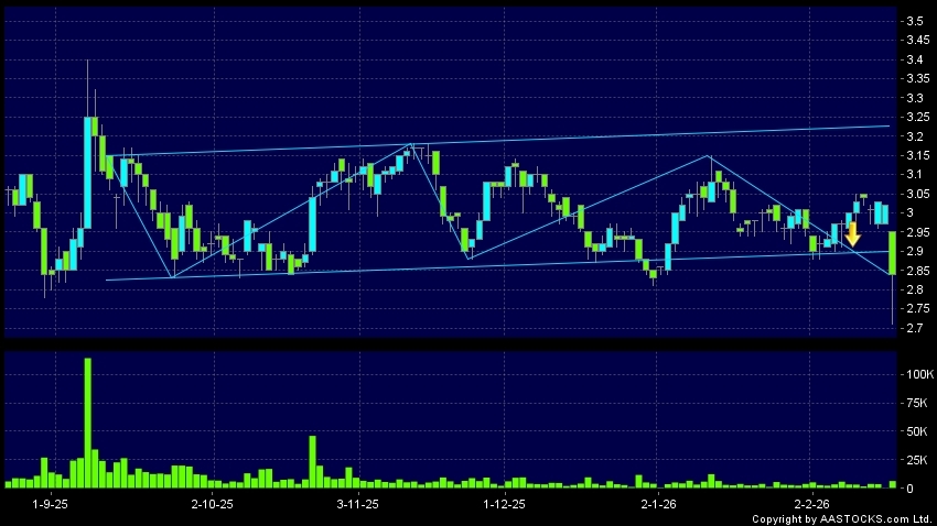 免責聲明:以上金融市場數據、報價、圖表 及/或各種技術分析指標乃根據公開資料分析和演釋自動生成的,僅作參考使用。此類自動生成的內容並不代表AASTOCKS.com Limited的立場。AASTOCKS.com Limited並不保證其準確性、完整性、實時性或者正確性。閣下應諮詢獨立專業意見,以核實定價資料或獲取更詳細的市場信息及須為所有跟隨此類自動生成的內容執行的交易或使用該內容負責。