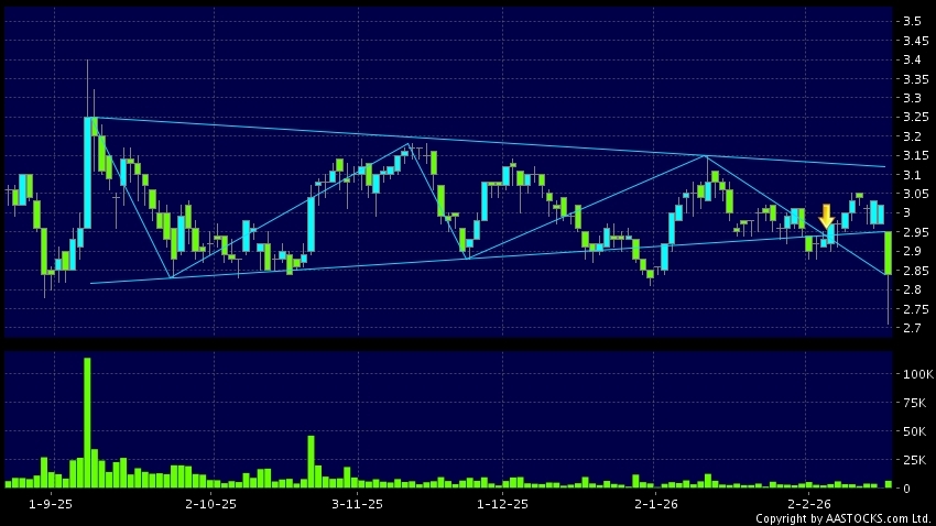 三角形向下突破是指股價的波幅漸漸收窄,在圖表上形成三角形般的狀態。股價在三角形的末端向下突破,下跌趨勢形成,技術走勢偏軟。(港股報價延遲最少十五分鐘。沽空資料截至 2026-02-20 16:25。)