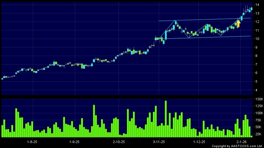 區域突破指股價在過去的一段時間只在一個範圍在內活動,然後股價上升作出突破,升穿區域的頂部,技術走勢向好。(港股報價延遲最少十五分鐘。沽空資料截至 2026-01-09 16:25。)