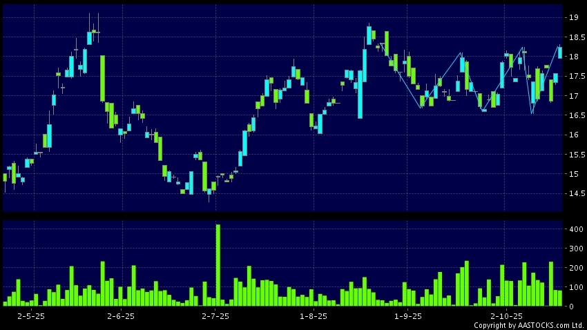 吉利汽車-R(80175.HK)  +0.590 (+3.358%)   呈現三重底突破向上。現價報18.250,上升3.870%,成交量8.20萬股,成交額1.49百萬。