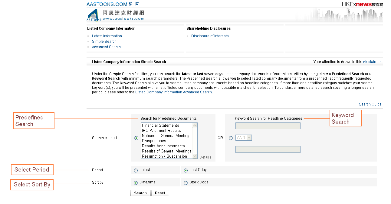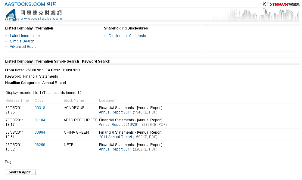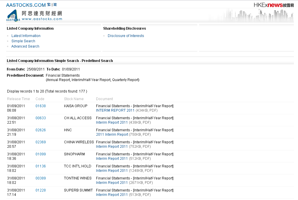 You can then select any one of the matched headline categories (e.g. Financial Statements