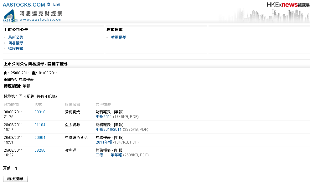 使用者可透過「簡易搜尋」內的預定搜尋或關鍵字搜尋輸入基本的搜尋參數,以搜尋在網站上登載的最新或過去七天之上市公司文件。