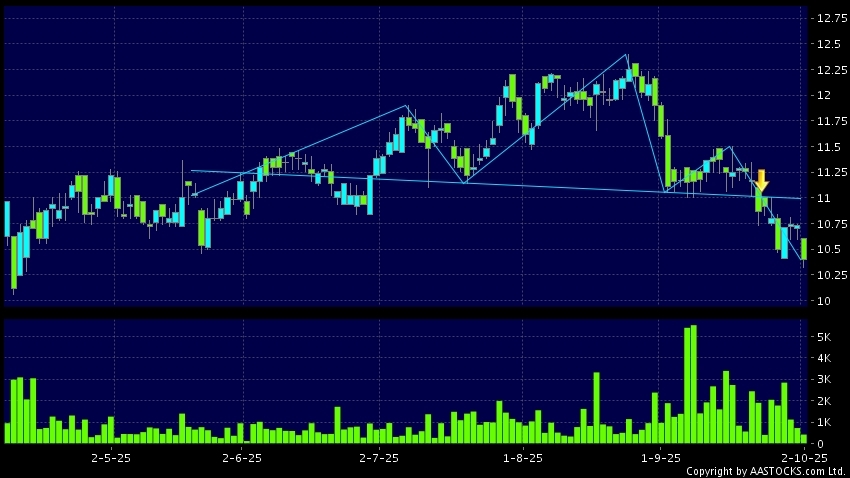 头肩顶是典型的沽出讯号,当股价跌穿支持线(颈线)时,跌势确认股价将持续下跌,技术走势偏软。(港股报价延迟最少十五分钟。沽空资料截至 2025-10-31 16:25。)