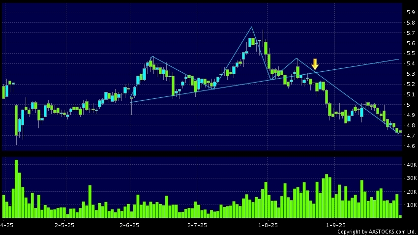 头肩顶是典型的沽出讯号,当股价跌穿支持线(颈线)时,跌势确认股价将持续下跌,技术走势偏软。(港股报价延迟最少十五分钟。沽空资料截至 2025-10-10 16:25。)