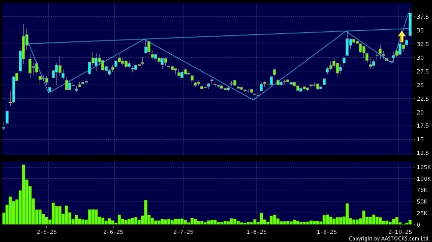 赤峰黄金(06693.HK) +4.400 (+13.261%) 沽空 $4.89千万; 比率 10.312% 呈現頭肩底向上突破,股價升穿頸線。现价报38.180,上升15.069%,成交量1.03千万股,成交额3.80亿。