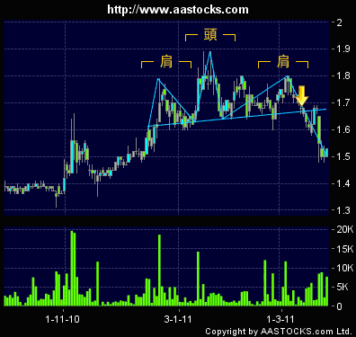 頭肩頂是典型的沽出訊號,當股價跌穿支持線(頸線)時,跌勢確認股價將持續下跌,技術走勢偏軟。