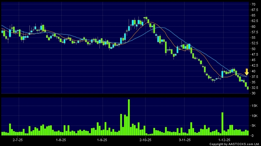 越疆(02432.HK) +0.260 (+0.686%) 沽空 $57.29萬; 比率 0.745% 10天移動平均線跌穿20天移動平均線,出現死亡交叉。現價報31.780,下跌3.697%,成交量2.51百萬股,成交額8.02千萬。