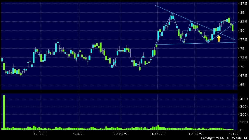 三角形向上突破是指股價的波幅漸漸收窄,在圖表上形成三角形般的狀態。股價在三角形的末端向上突破,形成上升趨勢,技術走勢向好。(港股報價延遲最少十五分鐘。沽空資料截至 2026-01-02 16:25。)